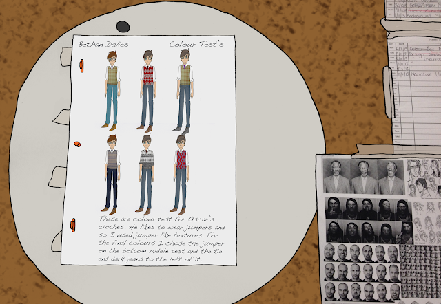 Again I was having real trouble pinning down what I wanted so I drew different outfits and hair styles to see what would work. In the end I went with the jumper and jeans outfit in the top left